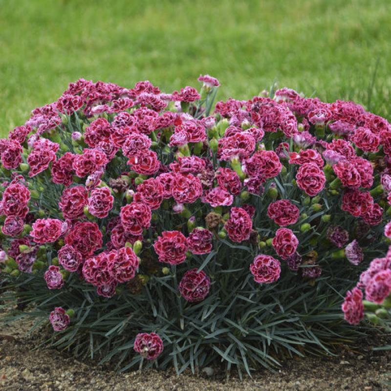 This colorful perennial produces loads of semi-double, velvety red flowers with near white edge atop a low mound of silvery blue foliage. Use it to edge sunny borders and pathways.