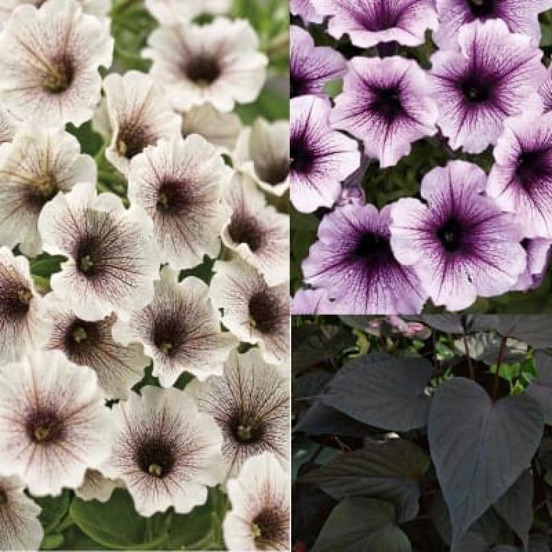 Petunia Supertunia Bordeaux, Petunia Supertunia Latte, Ipomoea Sweet Caroline Sweet Heart Mahogany