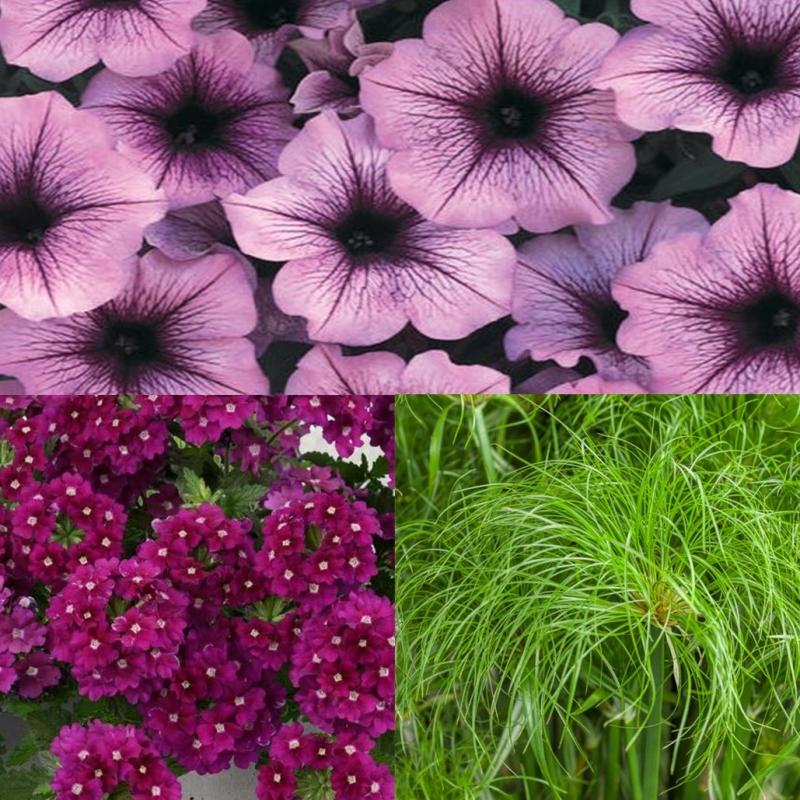 Verbena Vanessa Magenta, Petunia Supertunia Bordeaux, Orn Grass Cyperus Prince Tut