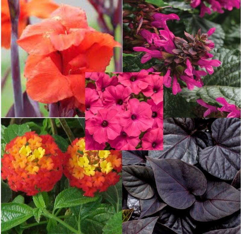 Canna Australia, Salvia Bodacious Rhythm & Blues, Petunia Supertunia Vista Fuchsia, Ipomoea Sweet Heart Jet Black