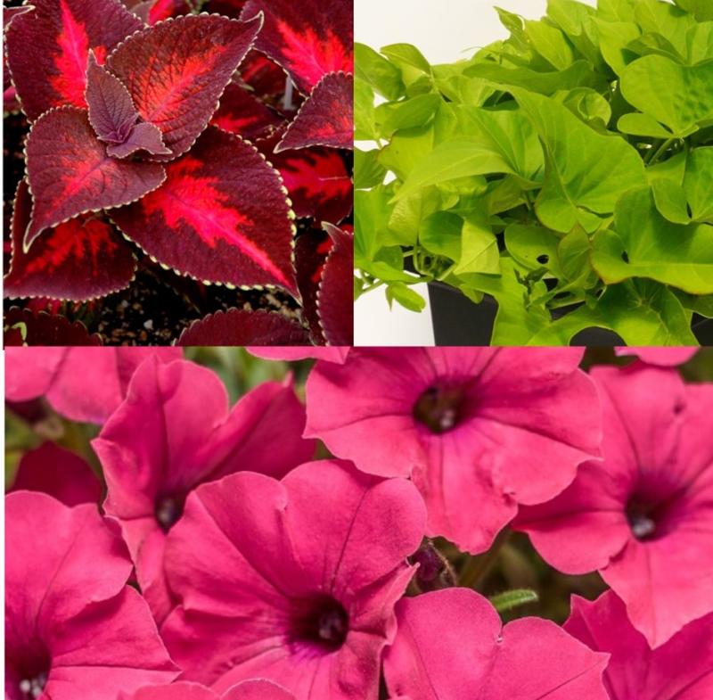 Coleus All That Jazz, Ipomoea Marguerite, Petunia Supertunia Vista Fuchsia
