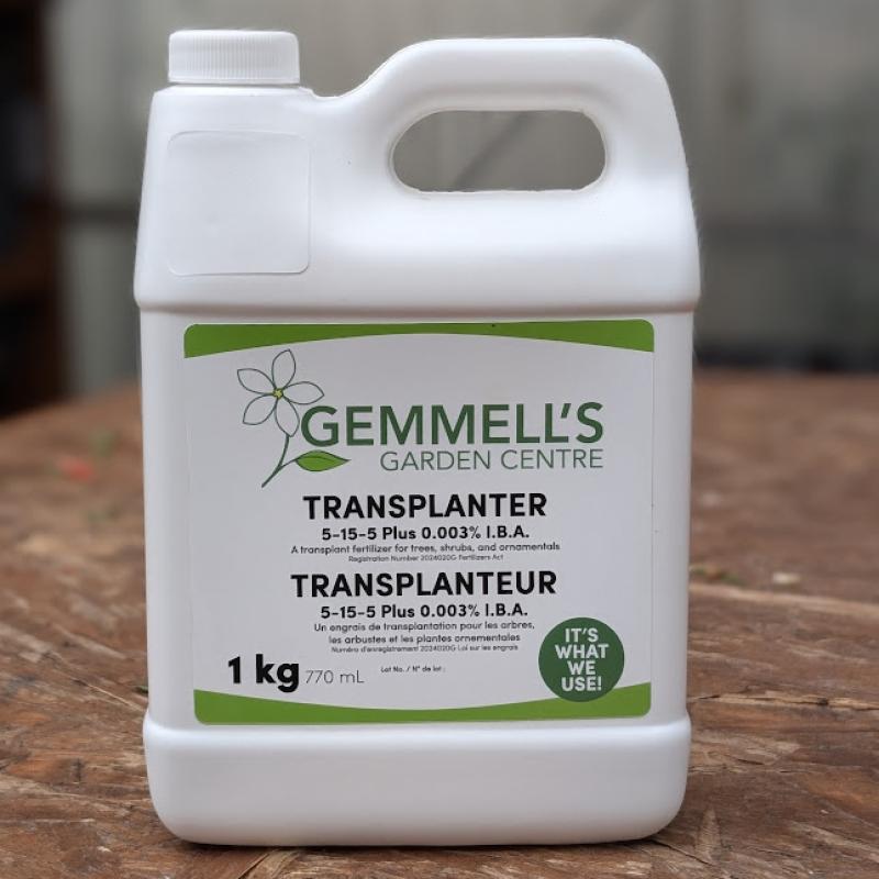 Gemmell's Transplanter 5-15-5 is a starter fertilizer containing I.B.A. (a plant growth regulator), and natural growth hormones derived from kelp. Diluted with water, this solution reduces transplant shock, provides nutrients and helps initiate root development.