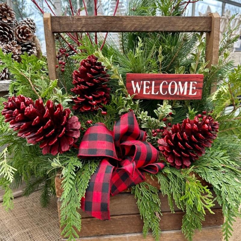 This workshop includes: rustic wooden box, fresh Ontario greens, a festive outdoor sign stake, & a bow.