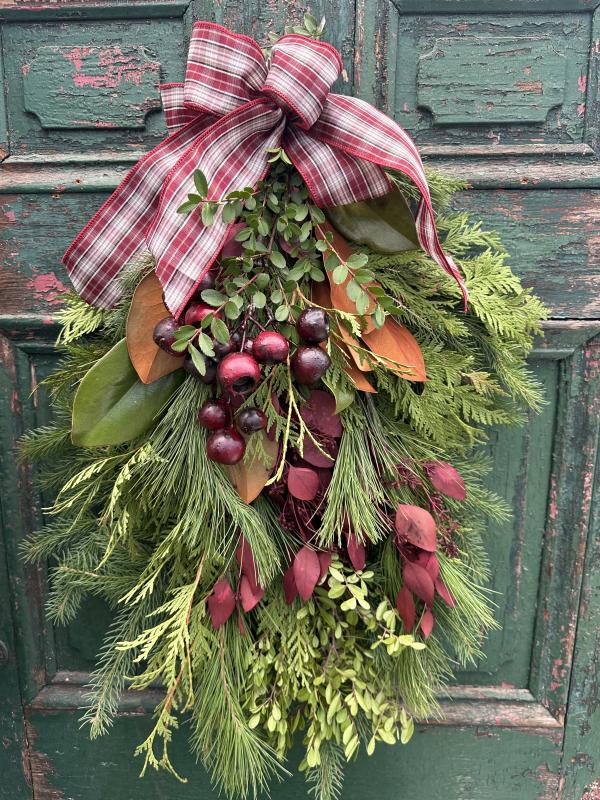 greens, pinecones, berries, ribbon and a festive décor accent. We will take you