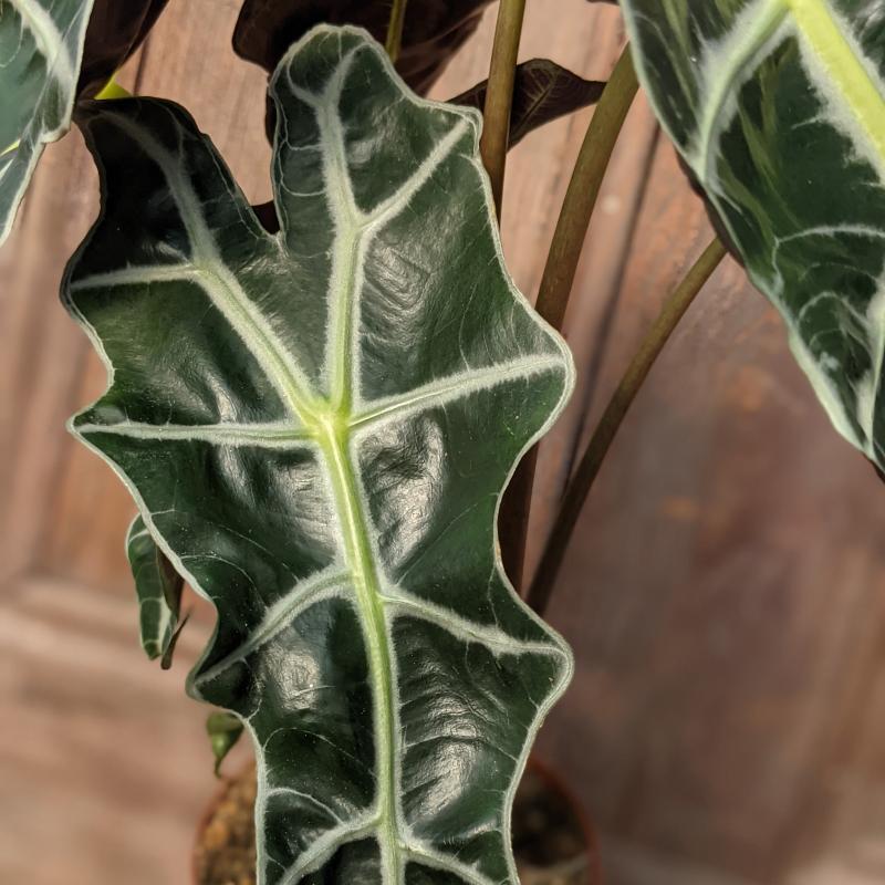 Alocasia is sometimes known as the Kris Plant, Elephant Ear or African mask plant. The impressive and stunning leaves are arrowhead or shield shaped with large protruding white veins running through them which contrasts strongly with the rest of the dark green leaf.