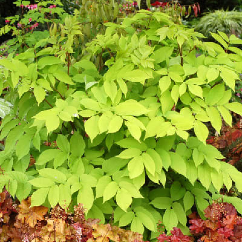 General Information: Shade, forms a dazzling 3' tall x 3' wide clump that emerges in mid-spring with bright gold compound leaves. With a few hours of sun, the foliage remains bright gold through the summer, at which time the clumps are topped with 2' tall spikes of tiny white flowers followed by black fruit.