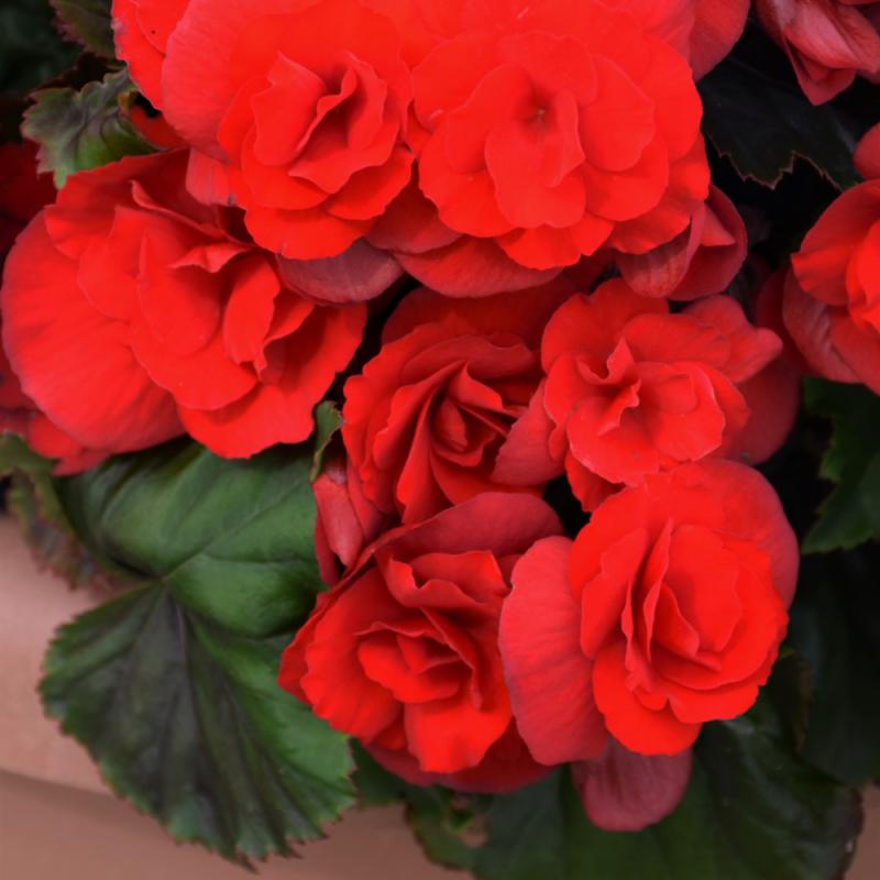Beautiful scarlet blooms stand out on top of deep dark green colored leaves