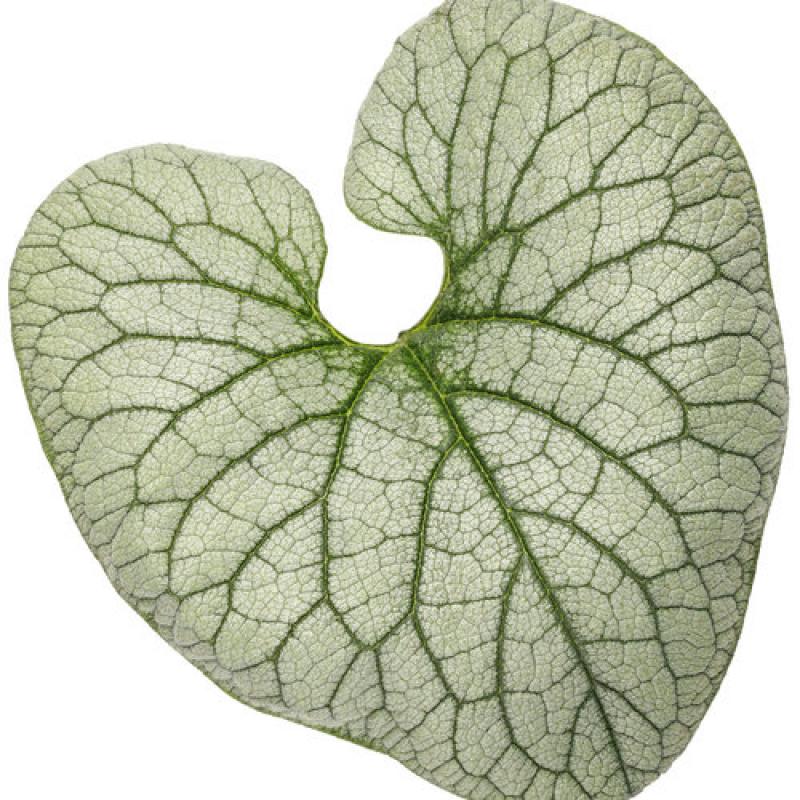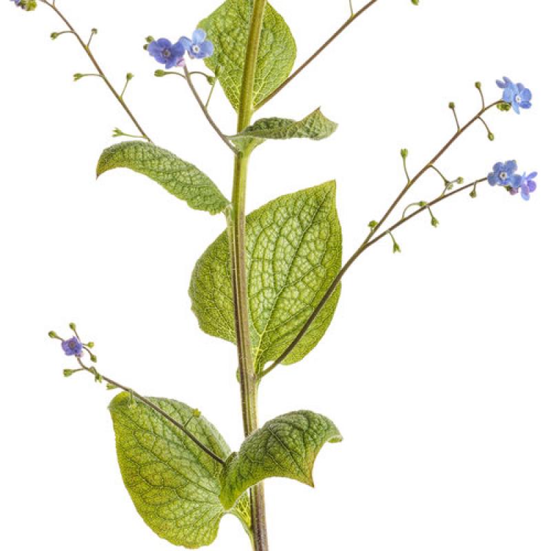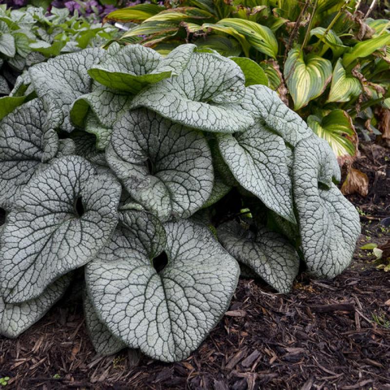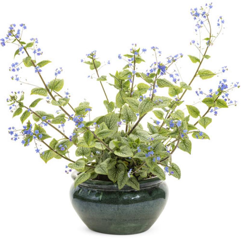 Heart-shaped leaves have a silver overlay and a narrow band of dark green veining. Baby blue, forget-me-not type blossoms.