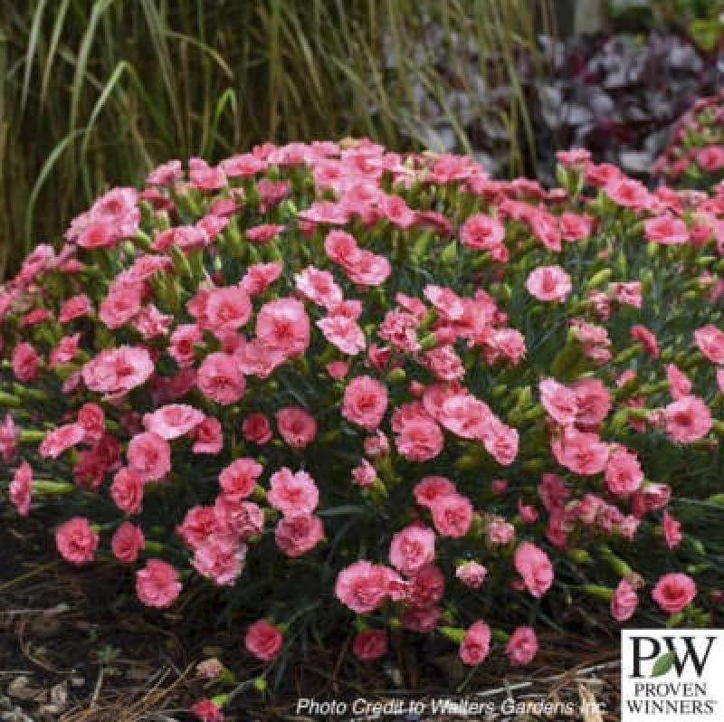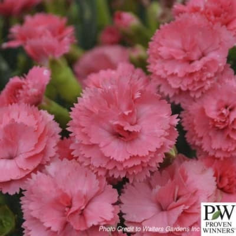 'Classic Coral' is the long-awaited missing colour of the FRUIT PUNCH® series. In early summer a splash of double, striking coral pink flowers is produced over a tight, compact mound of blue-green foliage. Members of the FRUIT PUNCH® series all share the following traits: semi-double to double, fragrant flowers, and good heat and humidity tolerance. A quick shearing after flowering will encourage rebloom in early fall. FRUIT PUNCH® Dianthus is just the right size for the front of the sunny border and uses in combination containers.