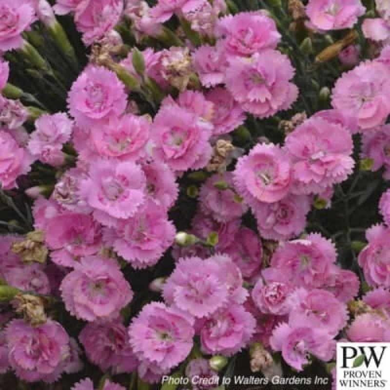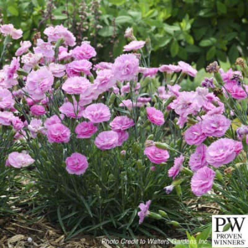 Deer resistant, low maintenance and drought tolerant attracts butterflies, fragrant, cute cut flower—what more could one want in a perennial? The Dianthus FRUIT PUNCH® series delivers all that and more in your choice of four colours. Double flowers stand like mini carnations atop a short mound of evergreen foliage in early summer. A quick shearing after flowering will encourage them to rebloom in early fall. Dianthus is just the right size to edge the front of the sunny border and use in combination containers