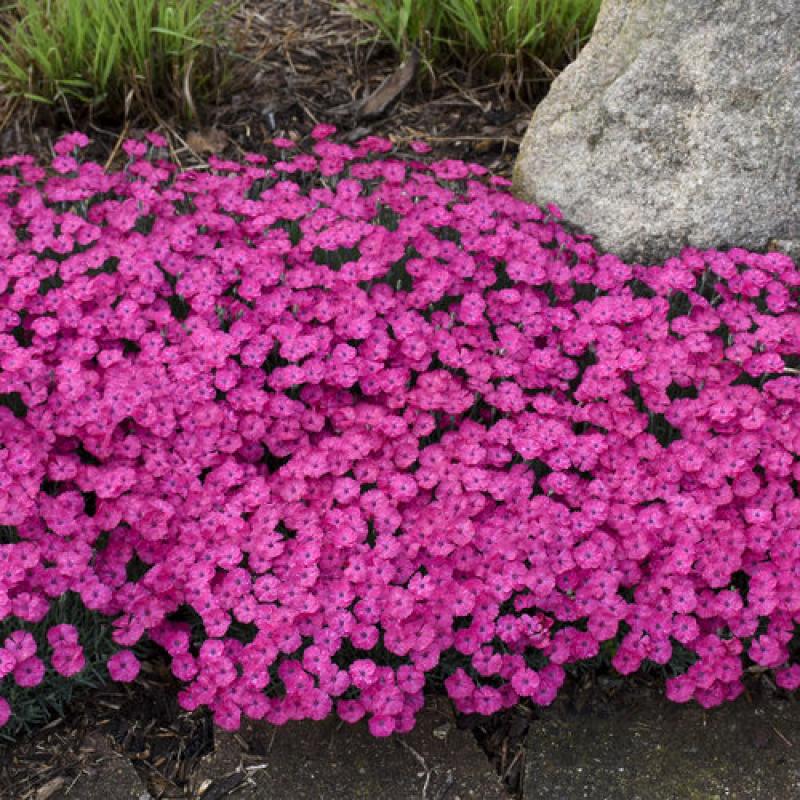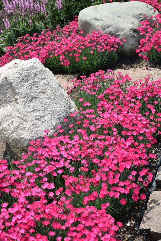 This brightly colored perennial produces single, vibrant magenta pink flowers atop a low mound of glaucous blue foliage. Use it to edge sunny borders and pathways.