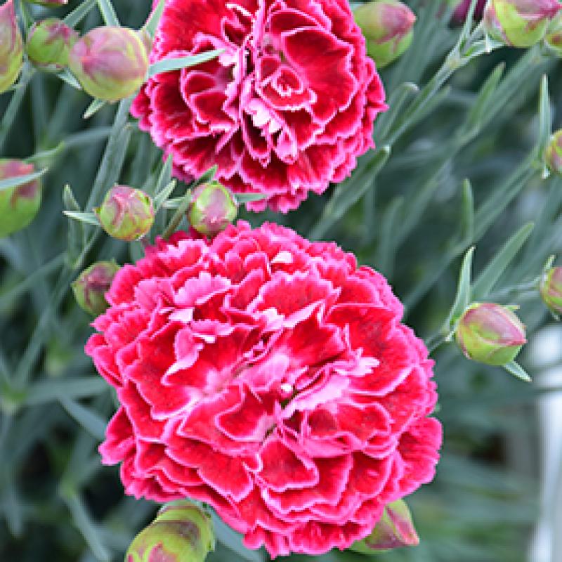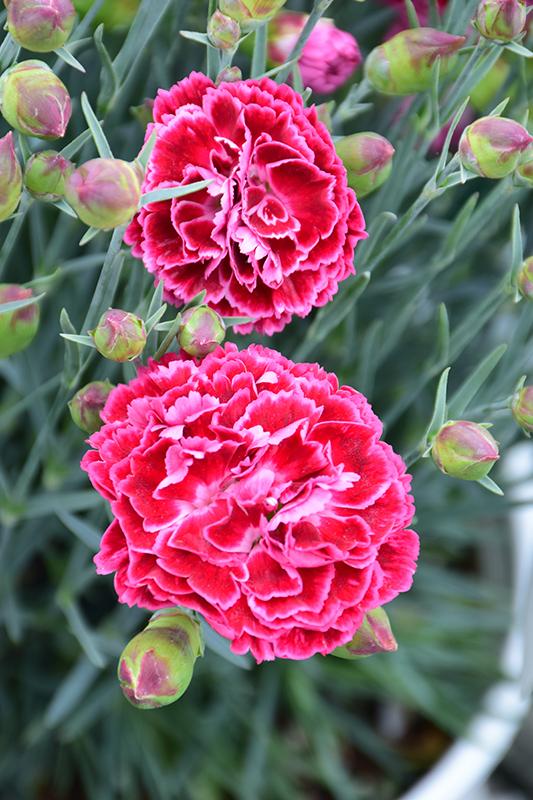 This colorful perennial produces loads of semi-double, velvety red flowers with near white edge atop a low mound of silvery blue foliage. Use it to edge sunny borders and pathways.