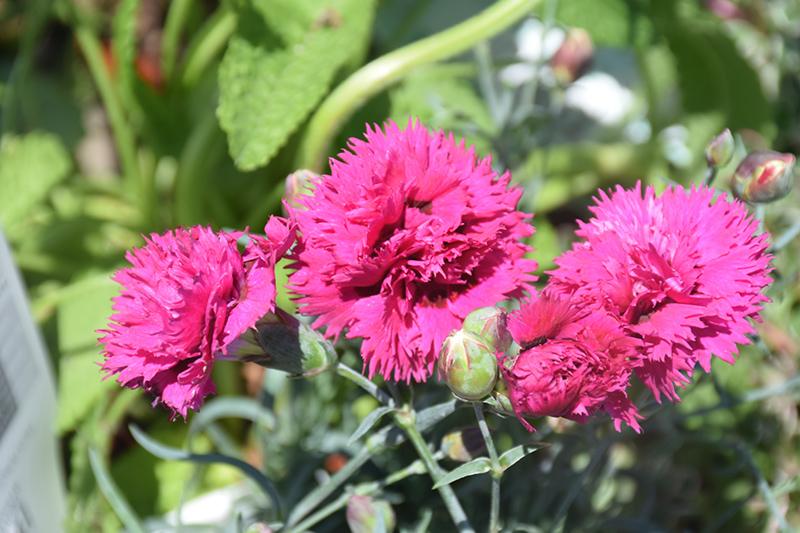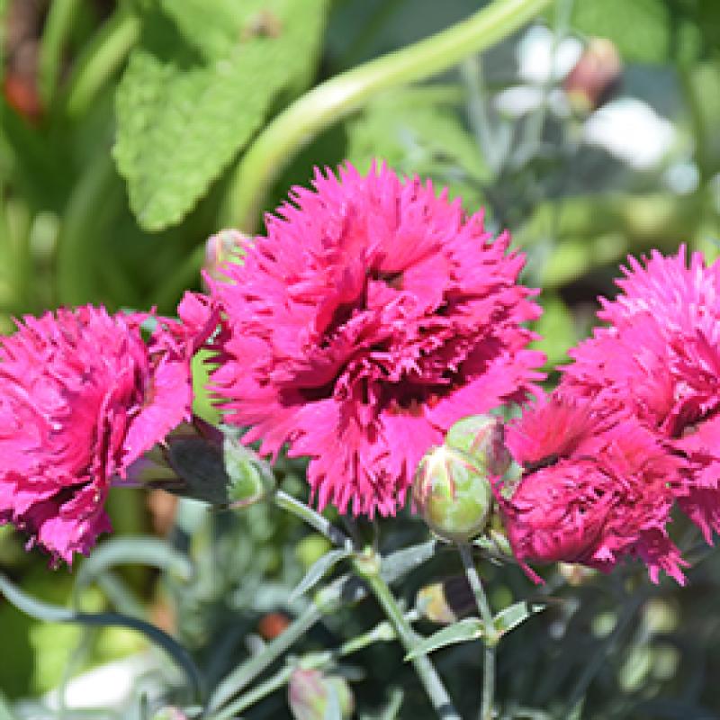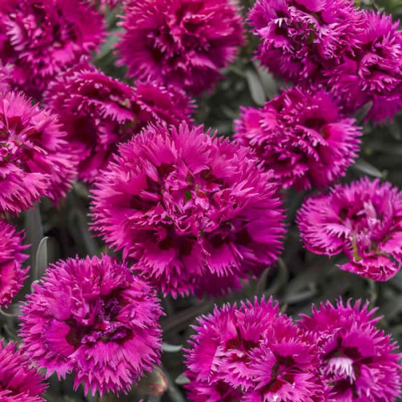This colorful perennial produces loads of double, vibrant fuchsia pink flowers with a deep red eye and heavily serrated edges atop a low mound of steel blue foliage. Use it to edge sunny borders and pathways.
