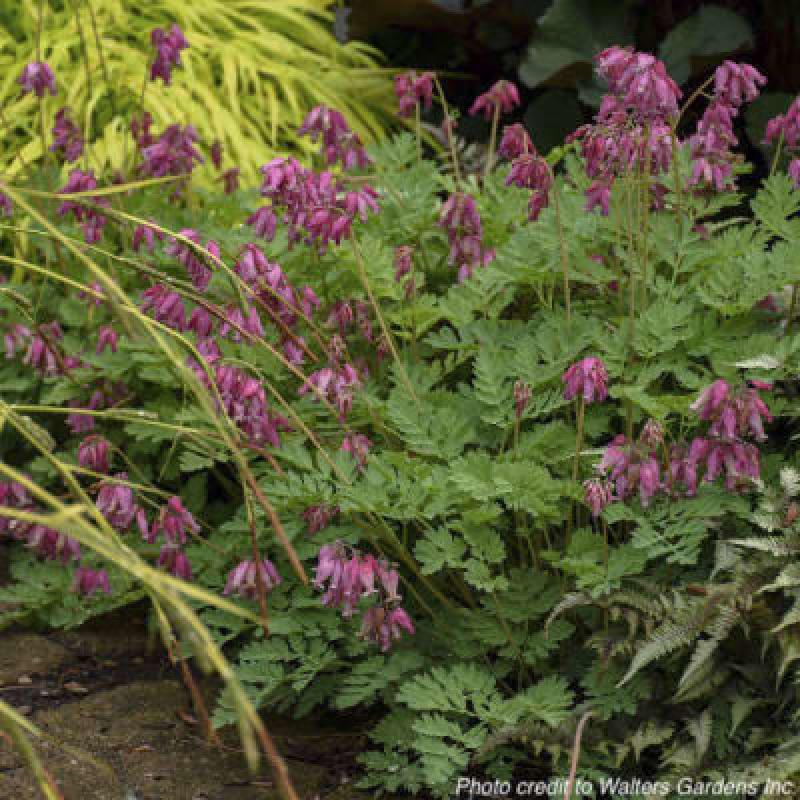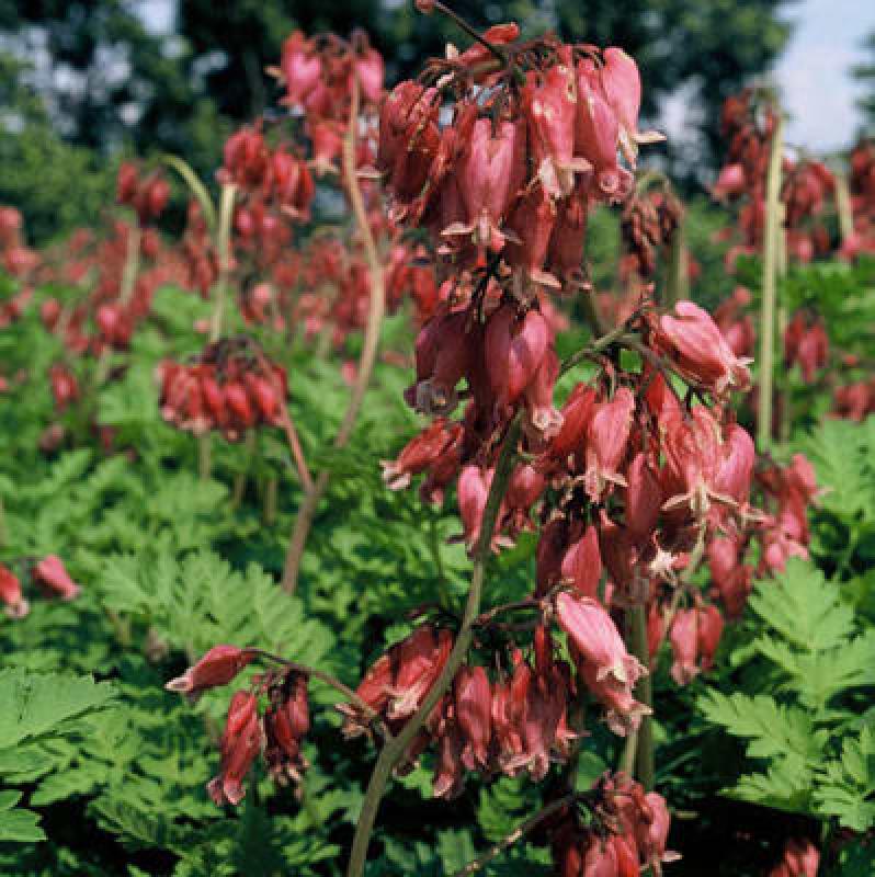 Dark reddish-pink, heart-shaped blooms dance charmingly above spreading mounds of ferny, blue-green foliage. This selection is everblooming, flowering most freely in spring and continuing throughout the summer and into fall. It does not set seed. It also seems to tolerate more sun and summer heat than most other varieties. Unlike the Common Bleeding Heart, D. 'Luxuriant' will not go dormant in midsummer as long as the soil is kept moist. Rather, it will enchant passersby all season long.