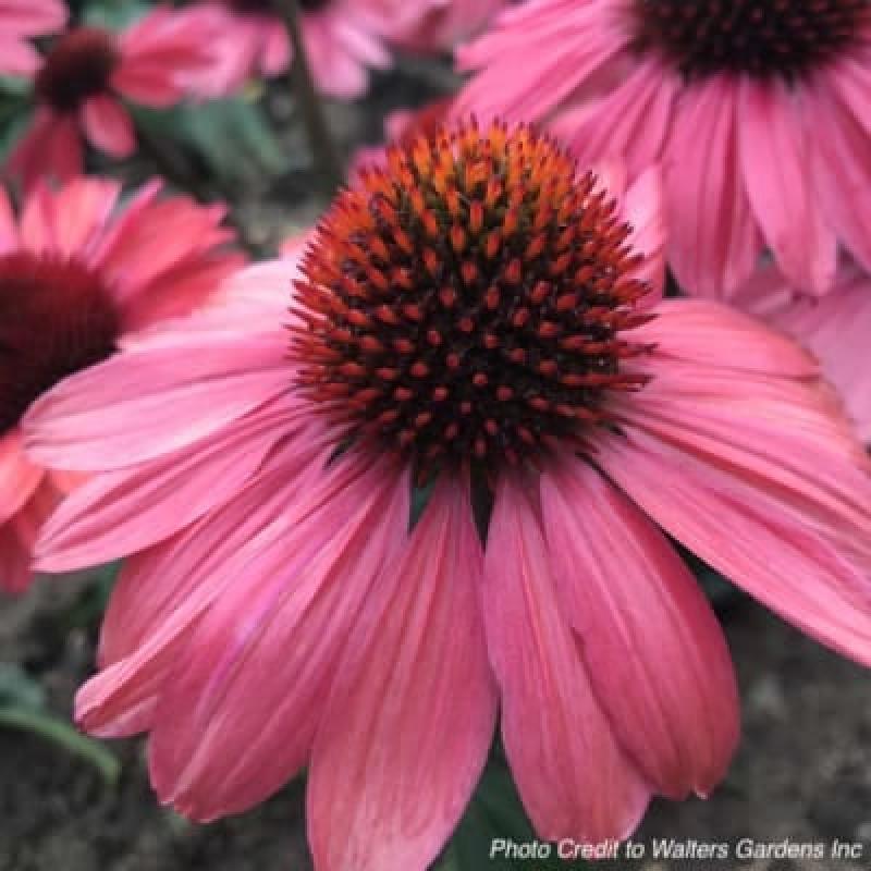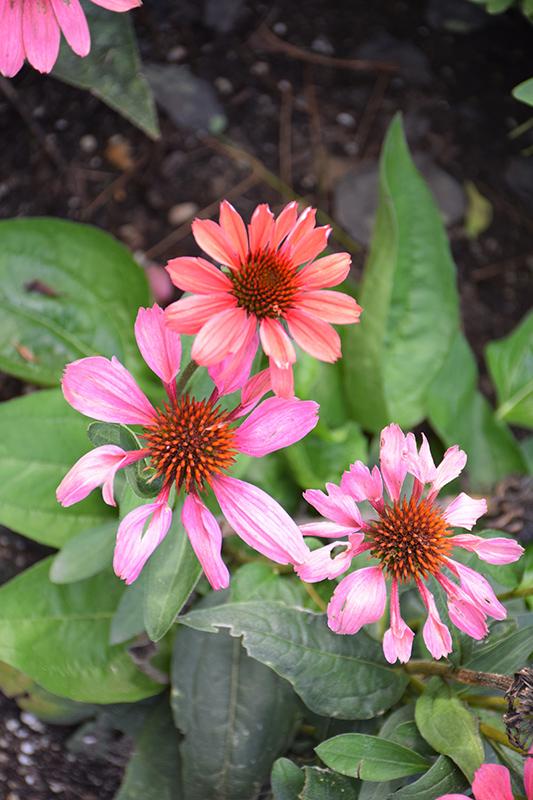 Large, 5" vibrant coral pink flowers mature to lavender-pink with wide petals. Dark, near-black stems have a matching dark cone. The tallest of the collection.