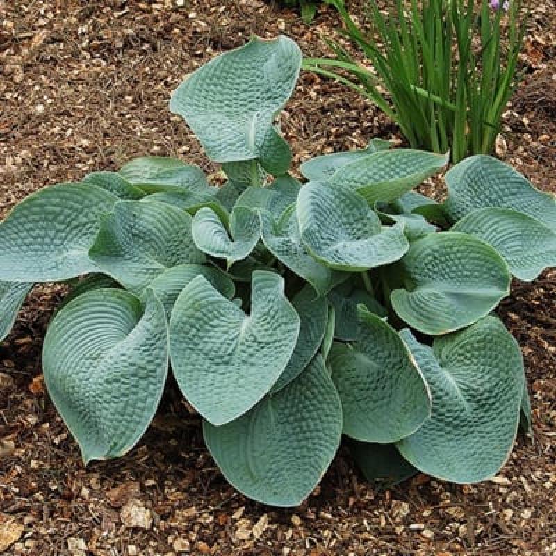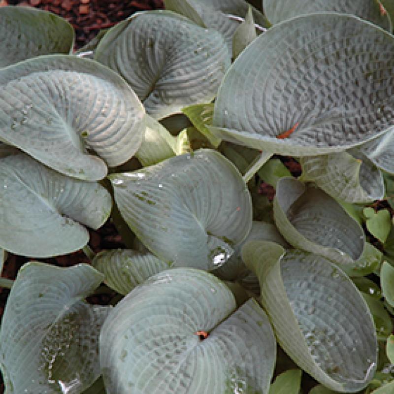 Dark blue-green, seer suckered leaves with heavy substance display a unique cupped form up to 3 inches deep