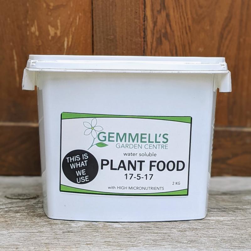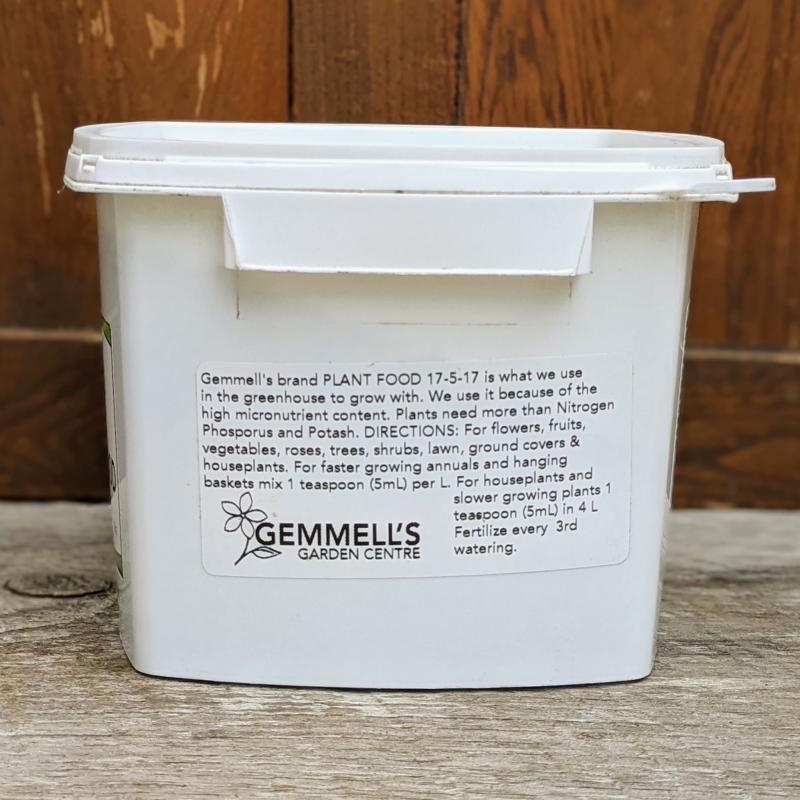 Gemmell's brand PLANT FOOD 17-5-17 is what we use in the greenhouse to grow with.