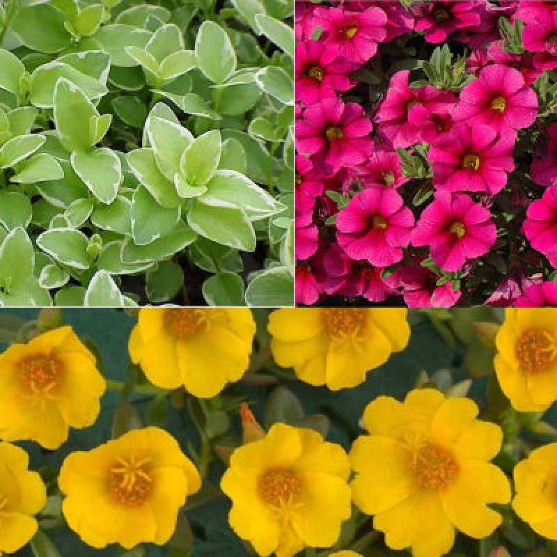 Vinca Variegated, Portulaca Mega Pazzaz Gold, Calibrachoa Aloha Kona Dark Red
