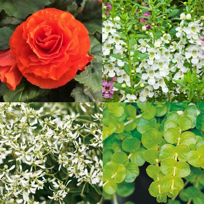 Begonia Nonstop Orange, Lysimachia, Euphorbia Diamond Frost, Angelonia Archangel White
