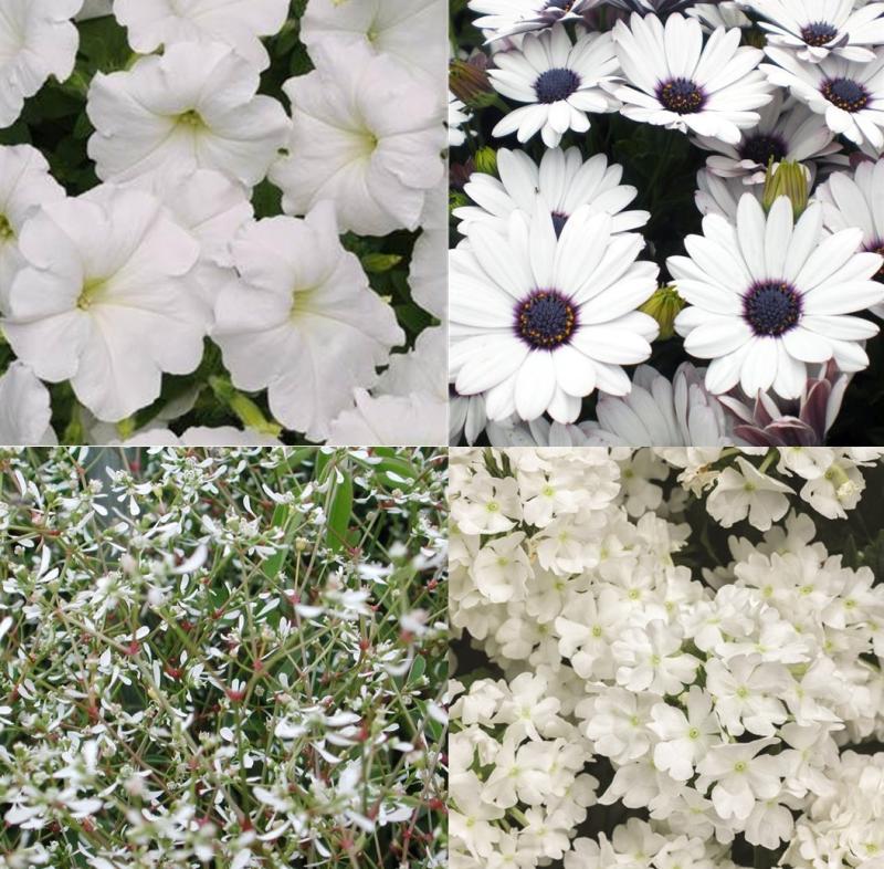 Petunia Easy Wave White, Verbena Vanessa White, Euphorbia Diamond Frost, Osteospermum Gelato Almond
