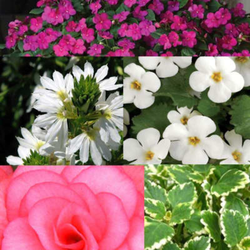 Begonia Nonstop Pink, Plectranthus, Impatiens Violet Shades, Bacopa White, Scaevola White
