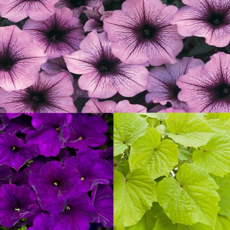 Petunia Supertunia Bordeaux, Petunia Supertunia Mini Vista Indigo, Ipomoea Sweet Caroline Bewitched Green With Envy.