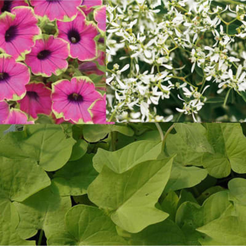 Petunia Supertunia Picasso In Purple, Euphobia Diamond Frost, Ipomoea Sweet Caroline Light Green