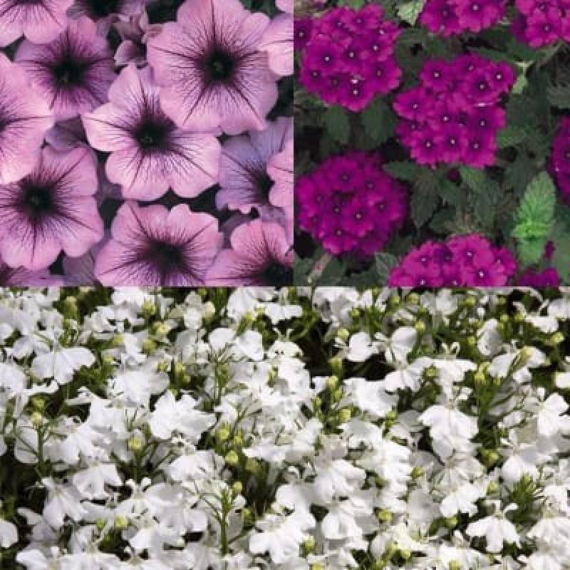 Petunia Supertunia Bordeux, Verbena Vanessa Purple, Lobelia White, Scaevola Surdiva White