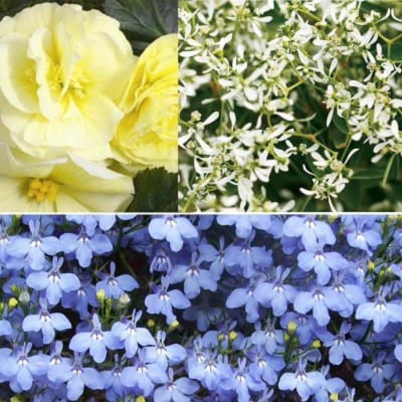 Begonia Nonstop Yellow, Euphobia Diamond Frost, Lobelia Dark Blue, Scaevola White