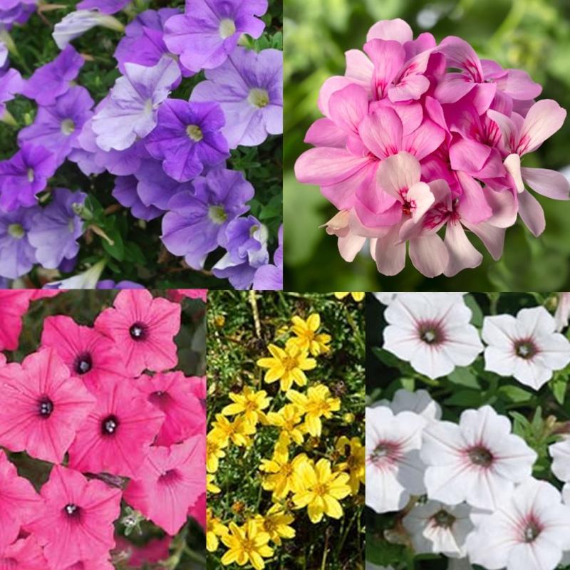 Petunia Vista Silverberry & Fuchsia, Petunia Surfina Heavenly Blue, Bidens Bidy Gonzales, Geranium Caldera Pink
