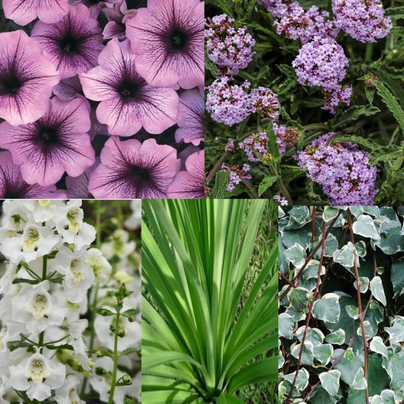 Verbena bonariensis Meteor Shower, Angelonia Archangel White, Petunia Supertunia Bordeaux, Algerian Ivy, Dracaena indivisa