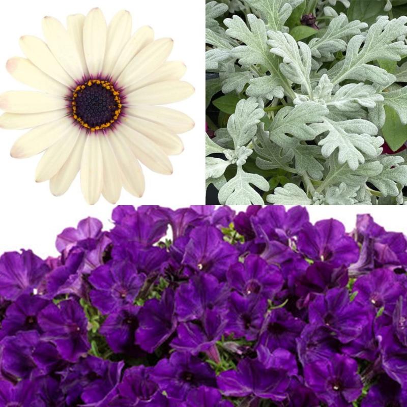 Osteospermum Gelato Almond, Petunia Supertunia Royal Velvet, Artemisia Sea Salt