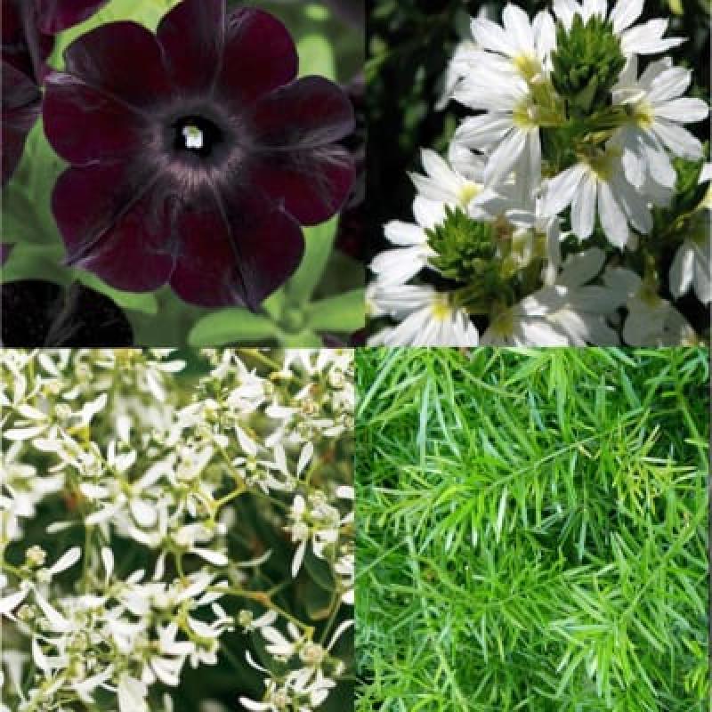 Diamond Frost Euphorbia, Petunia Black Magic, Scaevola White, Asparagus Sprengerii.