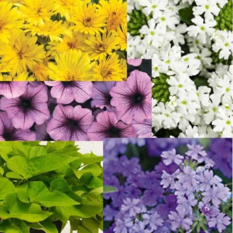 Lantana Havana Yellow, Petunia Supertunia Bordeaux, Verbena Vanessa White & Cobalt Blue, Calendula Cheers Yellow, Ipomoea Marguerite