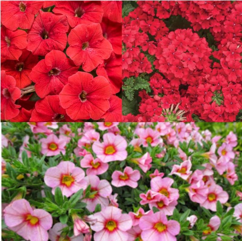 Petunia Hells Embers Red, Calibrachoa Aloha Tiki Soft Pink, Verbena Vanessa Red