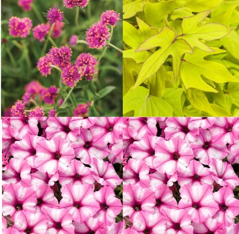 Gomphrena Tuffula Pink, Ipomoea Marguerite, Petunia Supertunia Mini Vista Pink Star