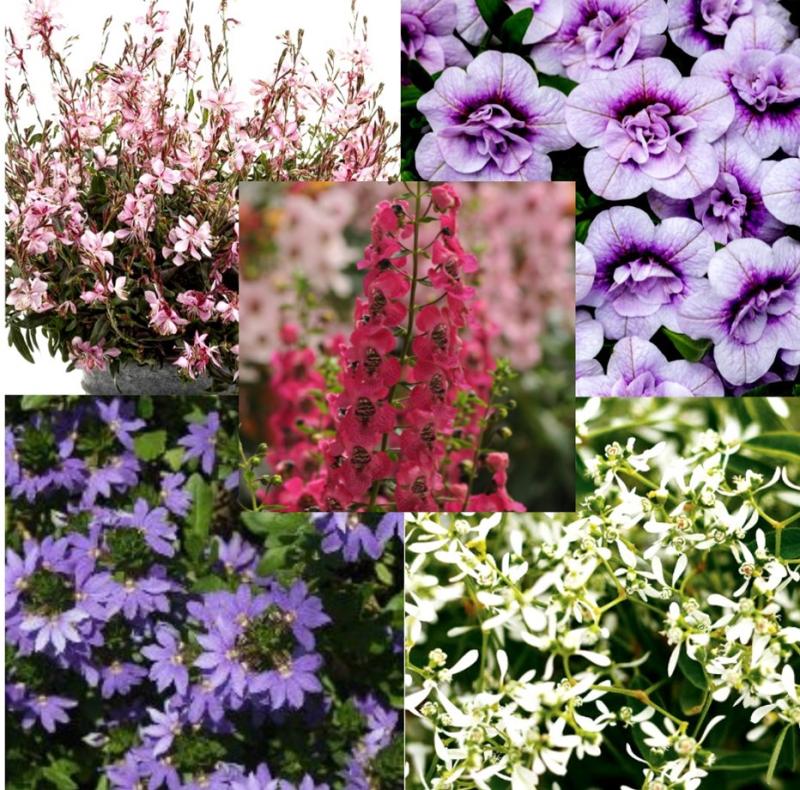 Gaura Graceful Light Pink, Angelonia Archangel Dark Rose, Euphorbia Diamond Frost, Calibrachoa Superbells Double Twilight, Scaevola Blessing BiColour Lavender