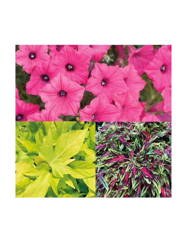 Coleus All That Jazz, Ipomoea Marguerite, Petunia Supertunia Vista Fuchsia