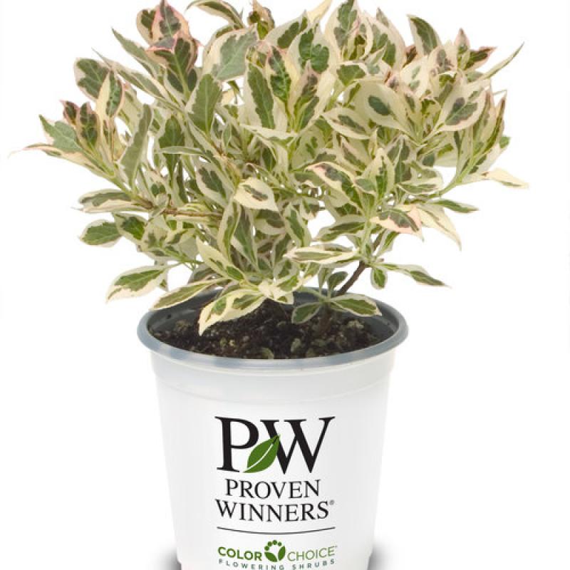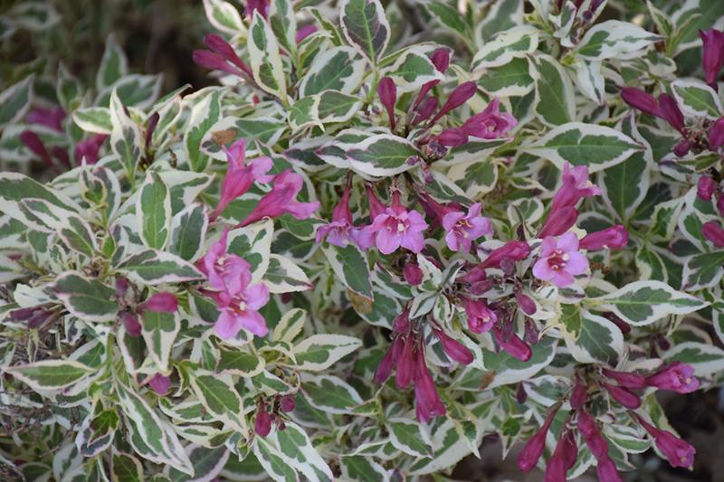 FEATURES Pink spring flowers and green and white variegated foliage all season long. Dwarf plant needs no pruning. Season long color. Dwarf. Deer resistant. Foliage Interest Attracts: Butterflies Hummingbirds Resists: Deer Small or Miniature CHARACTERISTICS Plant Type: Shrub Shrub Type: Deciduous Height Category: Short Garden Height: 12 - 18 Inches Spacing: 24 - 30 Inches Spread: 18 - 24 Inches Flower Colors: Pink Flower Shade: Pink Foliage Colors: Green Pink White Foliage Shade: Variegated Habit: Mounded Container Role: Filler PLANT NEEDS Light Requirement: Part Sun to Sun Maintenance Category: Easy Blooms On: Old Wood Bloom Time: Early Spring Mid Spring Late Spring Hardiness Zones: 4a, 4b, 5a, 5b, 6a, 6b Water Category: Average Uses: Container Landscape Uses Notes: Great for use in landscapes as an edging plant, mixed in the perennial border or in a container (plant in ground in fall.) Maintenance Notes: Prefers well drained soil but is adaptable to many soil types. It is best to prune right after flowering ceases, but pruning is rarely needed. Slow growth rate. Will continue to flower sporadically on the current season's growth. Medium moisture. Browning leaves in early fall are a result of the plant going into dormancy earlier than most weigela. This is a benefit letting the plant shut down earlier and prepare for winter. In southern states, plant in a partial shade location. Like most variegated plants, occasional reversions to the original green form may occur. These should be pruned out as needed. This dwarf masterpiece is a sport of Weigela florida 'Tango'. It is the first dwarf variegated Weigela to be introduced. Its tight habit and colorful foliage make it very versatile. Variegation changes depending on light exposure - whiter variegation in shade and pink variegation in full sun. Possible applications include an artistic drift along the edge of an annual or perennial bed or as an accent piece in a container. My Monet creates poetic beauty in any landscape and adds a splash of color to semi shady areas. Everyone who has seen this beauty falls in love at first sight. Use it like you would use Coleus, to add season long color, but don't worry about replanting next spring. This little shrub comes back year after year. My Monet has won numerous awards, including a Gold Medal from the Boskoop Royal Horticulture Society and a Gold Medal from Plantarium.
